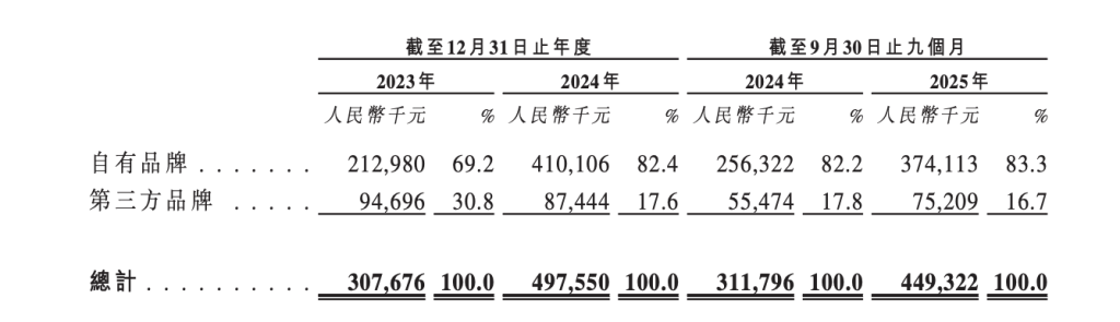 數據顯示,其自有品牌收入由2023年2.13億元增至2024年4.10億元,收入占比從69.2%提升至82.4%,2025年前三季度進一步升至83.3%。