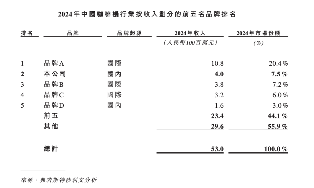 招股書援引弗若斯特沙利文數據顯示,就收入而言,該公司為中國咖啡機行業第二大品牌、國內第一大本土咖啡機品牌,2024年市場份額約7.5%;同期在半自動意式咖啡機賽道位居第一,市場份額為16.0%;在分體式半自動意式咖啡機細分領域市占率達27.9%。