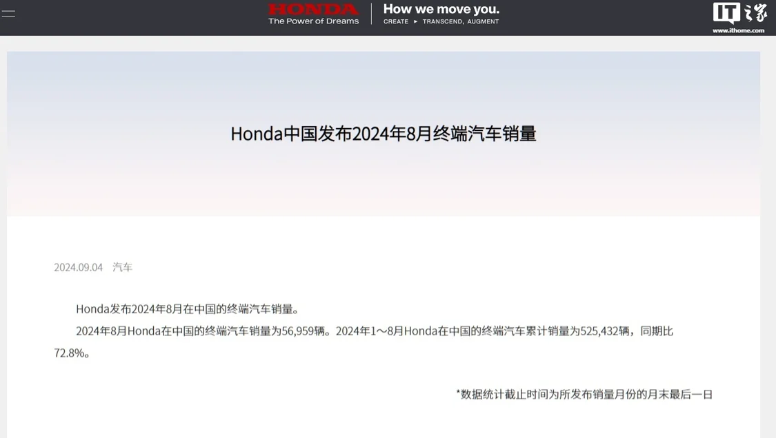 9 月 4 日消息,本田今天發佈了 2024 年 8 月在中國的終端汽車銷量情況。數據顯示,2024 年 8 月本田在中國的終端汽車銷量為 56959 輛,2024 年 1~8 月在中國的終端汽車累計銷量為 525432 輛,同比下降 27.2%。