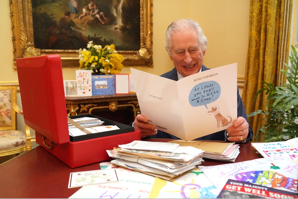 查爾斯本周早些時候告訴首相蘇納克(Rishi Sunak),他收到的一些善意的資訊讓他淚流滿面,白金漢宮在社交媒體上發佈了他閱讀一些卡片的片段。