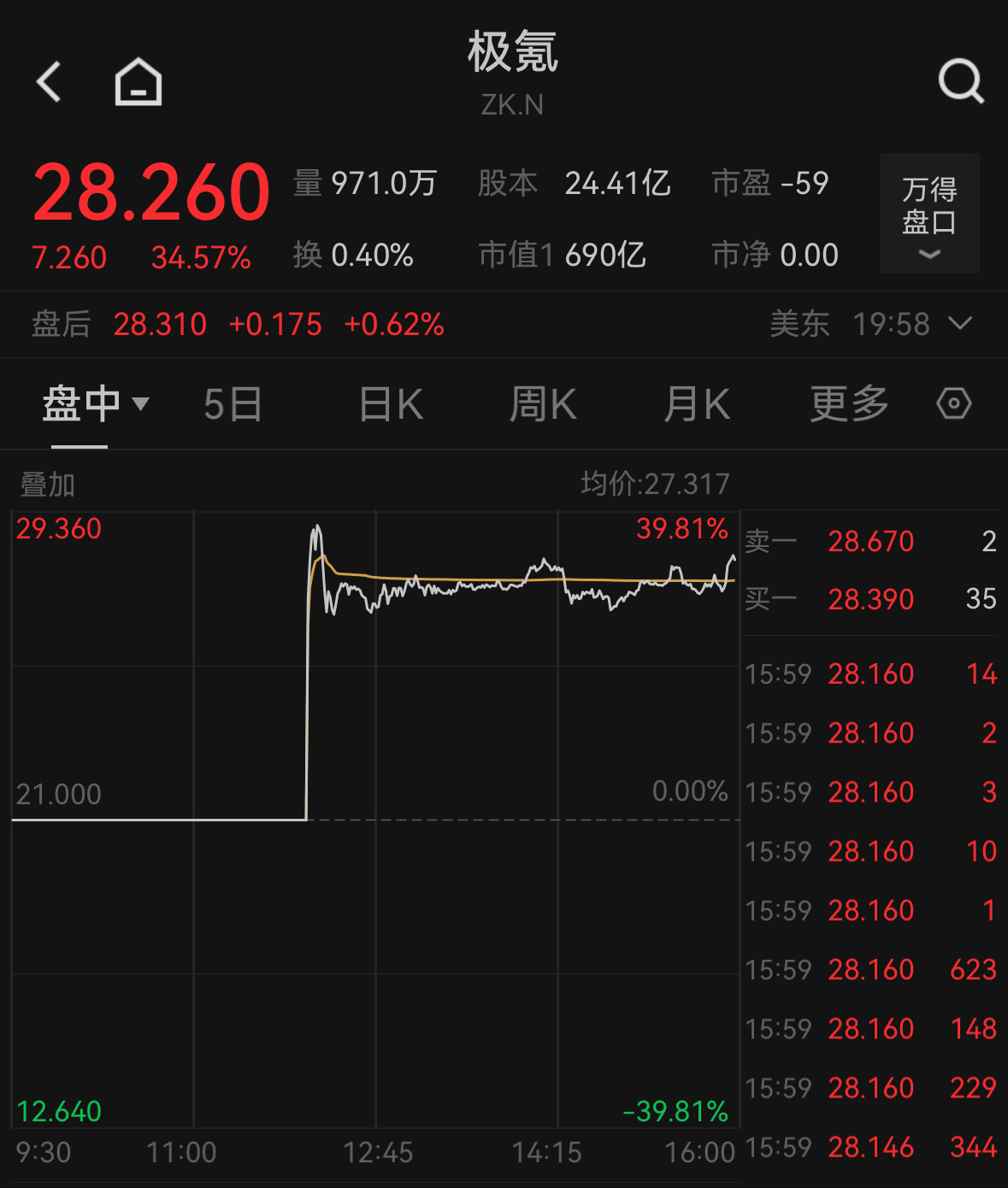 本網綜合報導 當地時間5月10日,極氪智能科技控股有限公司(下稱“極氪”)正式在美國紐交所掛牌上市,股票代碼為“ZK”,IPO發行價為每股21美元,位於預期範圍最高端。Wind客戶端顯示,極氪開盤價為26美元/股,首日上漲34.57%,收報於28.26美元/股,市值69億美元。