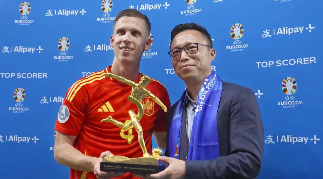 7月15日,2024歐洲杯正式收官,中國贊助商再次闖入全球視野。北京時間7月15日淩晨,歐洲杯決賽落幕,西班牙隊第四次奪冠;西班牙球員達尼·奧爾莫、英格蘭球員哈裏·凱恩等6名在賽事期間打進三球的球員,共同榮膺螞蟻集團全球化品牌Alipay+冠名的“得分王”獎盃。螞蟻集團董事長兼CEO井賢棟,作為贊助商代表,現場為作為“得分王”代表的奧爾莫頒發“得分王”獎盃。