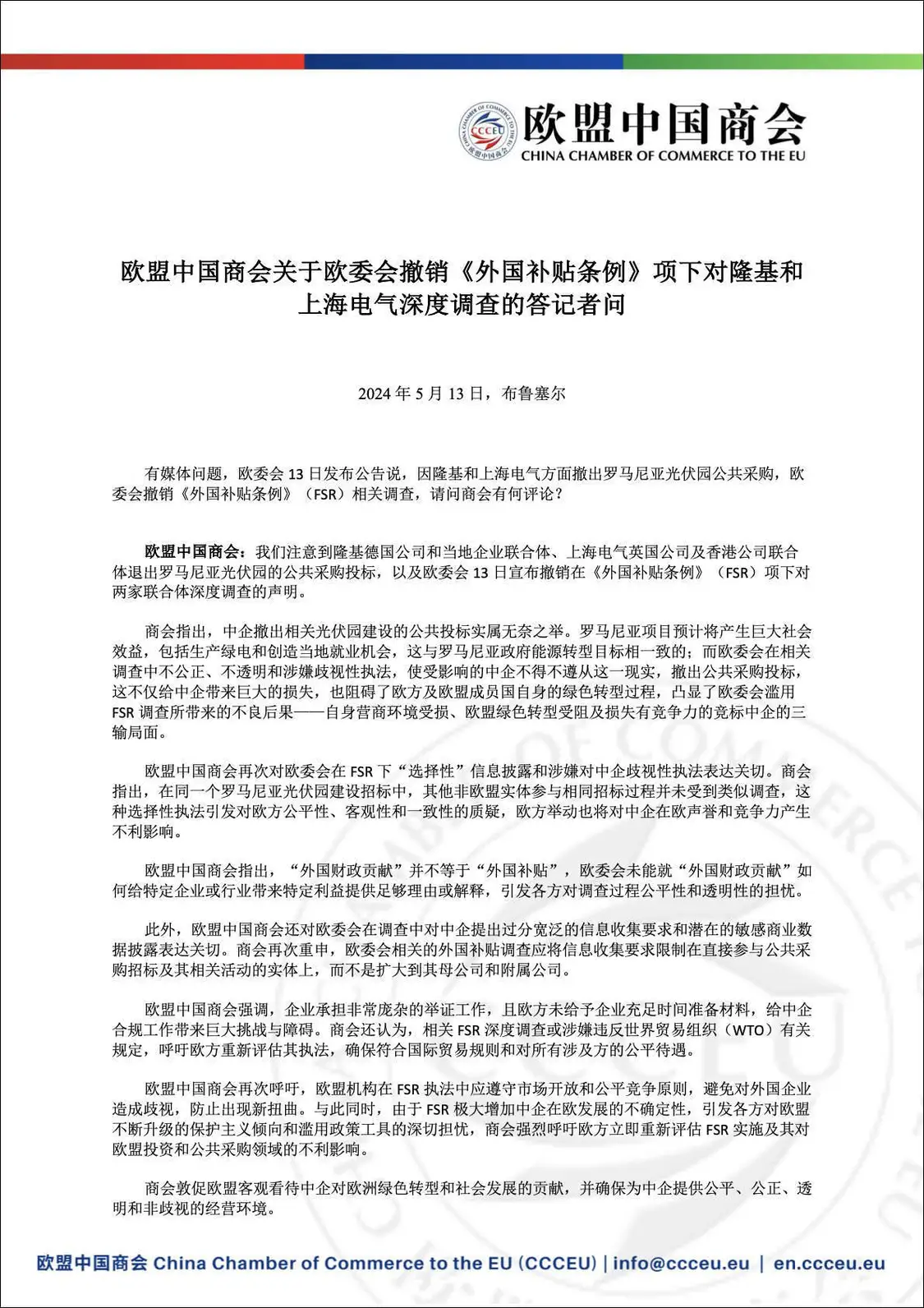 歐盟中國商會再次對歐委會在FSR下“選擇性”資訊披露和涉嫌對中企歧視性執法表達關切。商會指出,在同一個羅馬尼亞光伏園建設招標中,其他非歐盟實體參與相同招標過程並未受到類似調查,這種選擇性執法引發對歐方公平性、客觀性和一致性的質疑,歐方舉動也將對中企在歐聲譽和競爭力產生不利影響。
