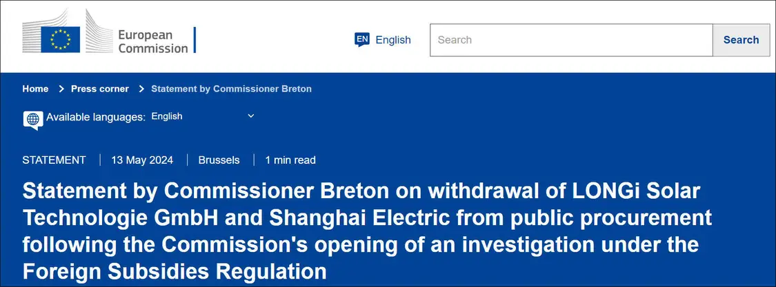 5月13日,歐盟委員會發佈聲明稱,由於兩家中企已表示退出競標歐盟成員國羅馬尼亞一太陽能專案,將結束對他們的調查。歐盟此前聲稱,有充分跡象表明中企子公司都獲得了“扭曲”歐盟市場的政府補貼,並根據《外國補貼條例》(FSR)啟動了兩項深度調查。
