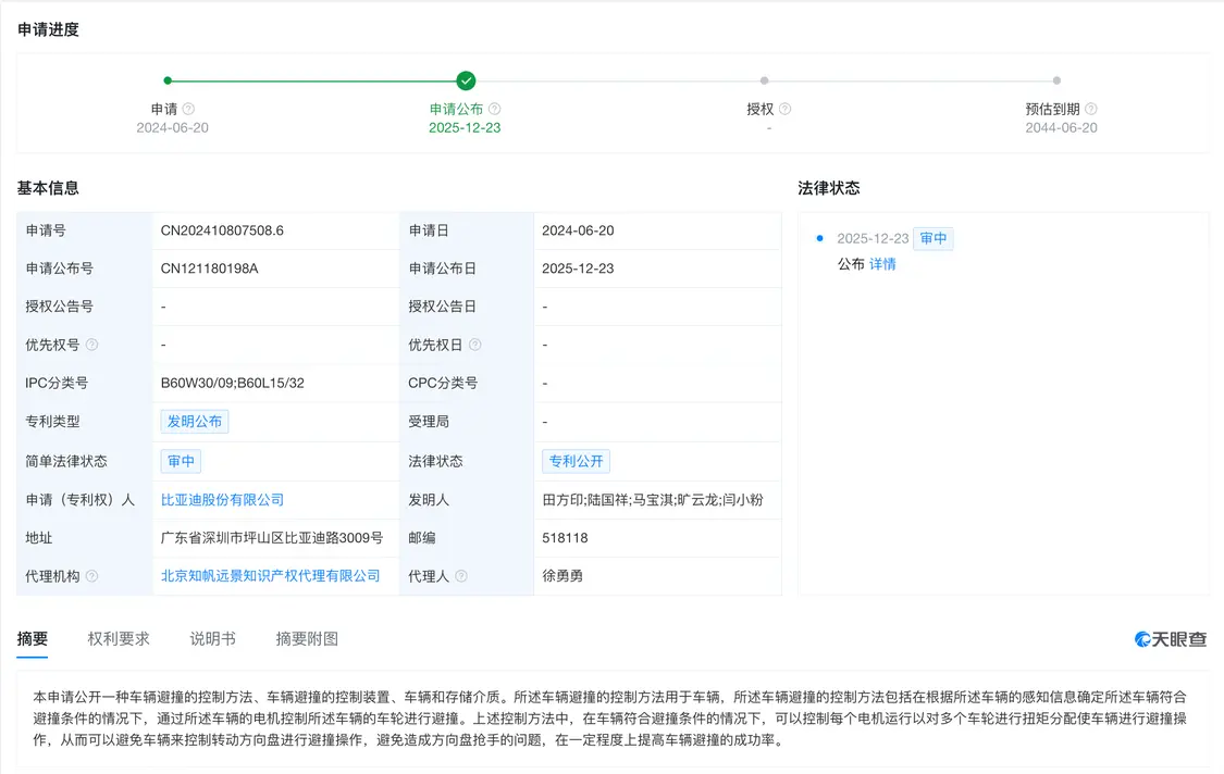 12月25日,天眼查顯示,近日,比亞迪股份有限公司申請的“車輛避撞的控制方法和控制裝置、車輛及存儲介質”專利公佈。