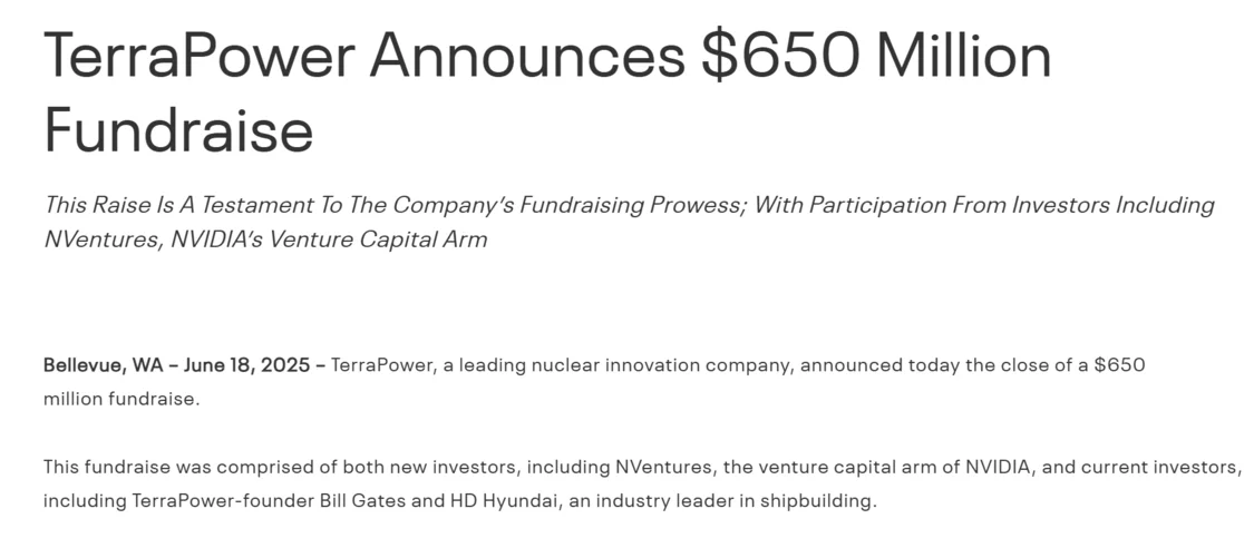 由前世界首富比爾·蓋茨創辦的泰拉能源(TerraPower)週三發表公告稱,已經完成新一輪6.5億美元的融資。公司披露,除了創始人蓋茨、韓國現代重工業等老股東繼續投資外,晶片巨頭英偉達旗下的風投部門NVentures也成為公司的新股東。
