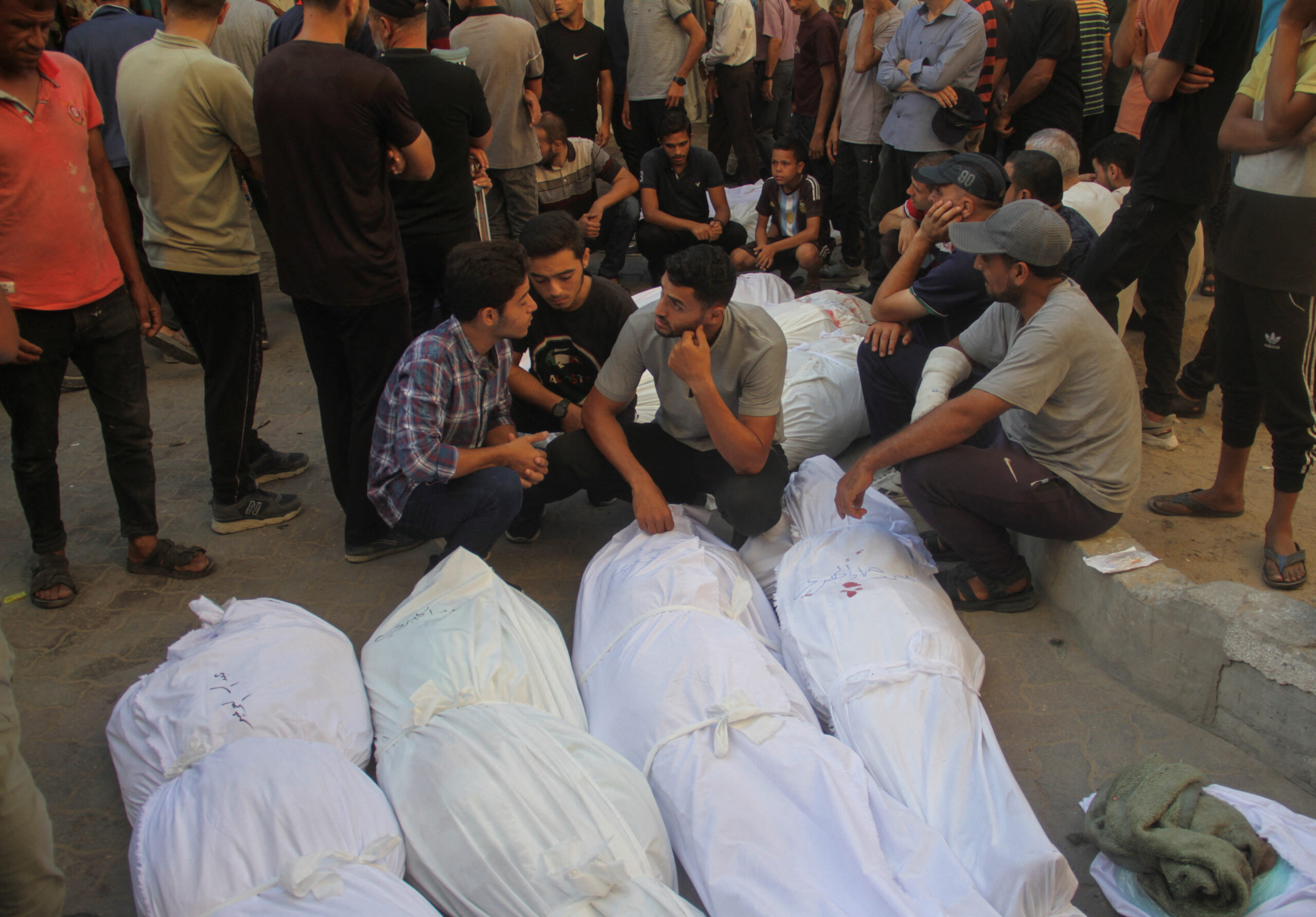 People react near bodies of Palestinians killed in an Israeli strike on a school sheltering displaced people, amid the Israel-Hamas conflict at a hospital in Gaza City August 10, 2024. REUTERS/Mahmoud Issa