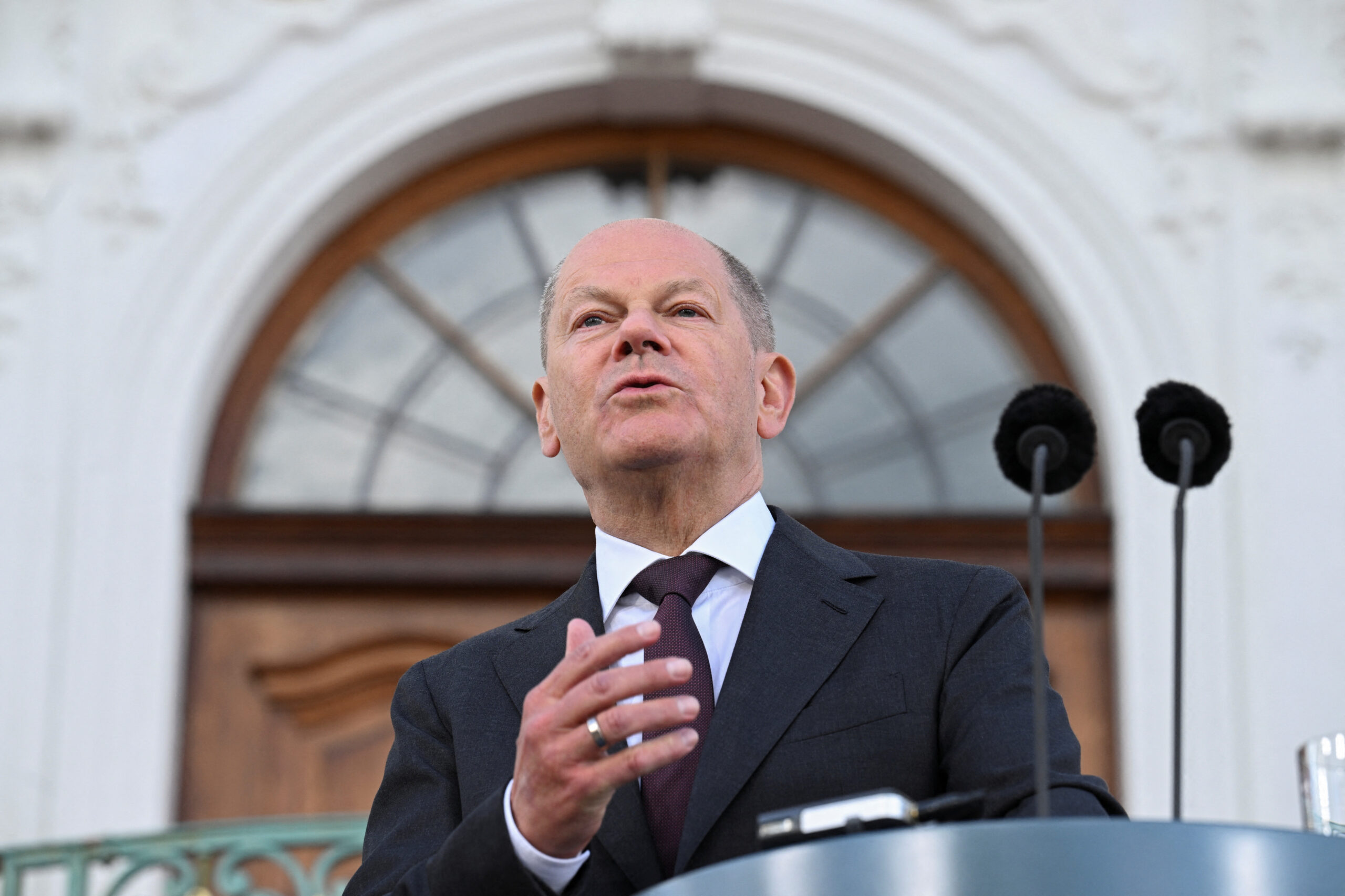 FILE PHOTO: German Chancellor Olaf Scholz speaks to reporters on the day of a joint Franco-German cabinet meeting at the German government’s guest house, Schloss Meseberg castle north of Berlin, in Gransee, Germany, May 28, 2024. REUTERS/Annegret Hilse/File Photo