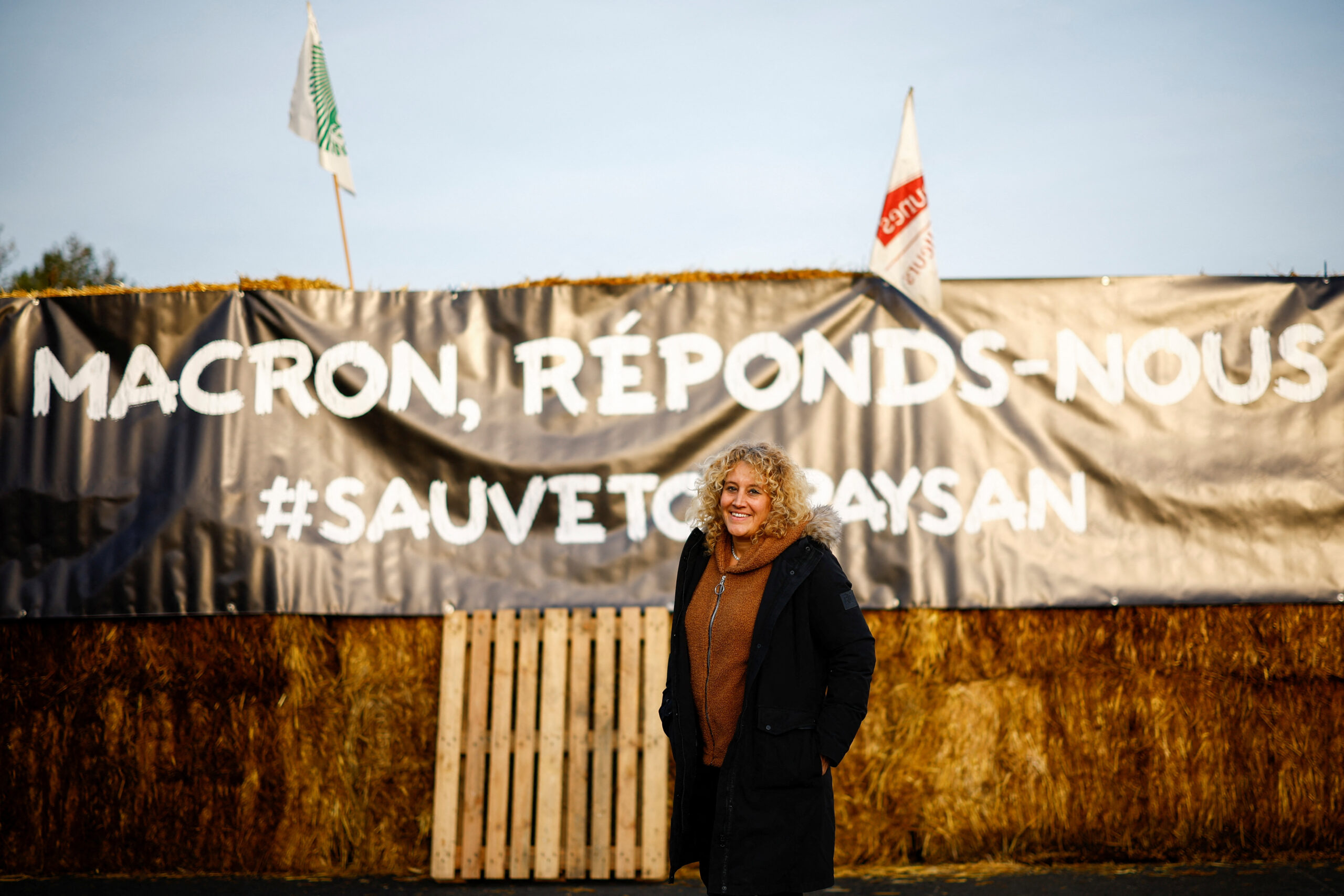 她說,馬克龍“根本不在乎”農民。她身後,一堆乾草捆上掛著一條橫幅:“馬克龍,回答我們。”