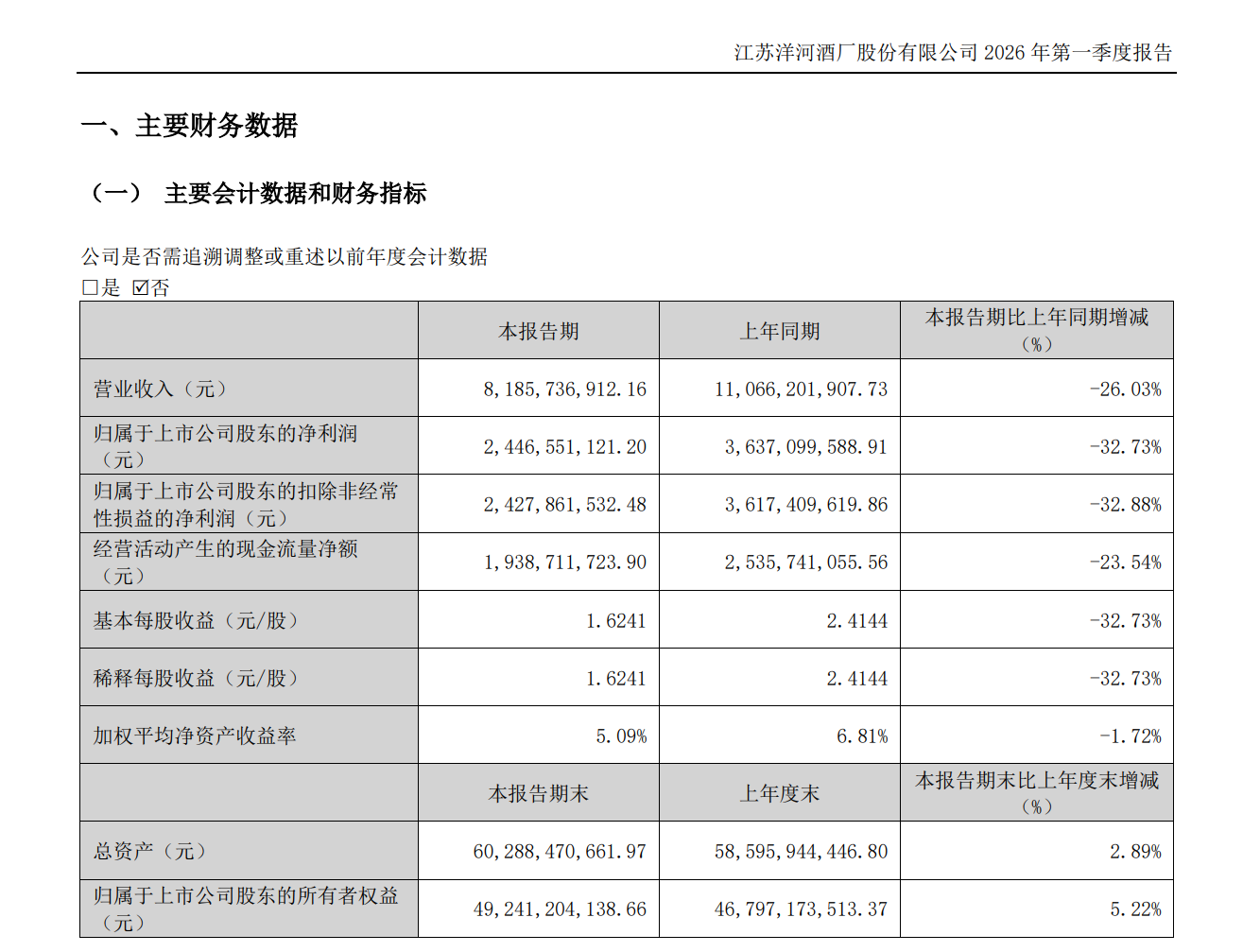 同日,洋河股份發佈2026年第一季度報告,報告期內,公司實現營業收入81.86億元,同比下降26.03%;歸母淨利潤24.47億元,同比下降32.73%。