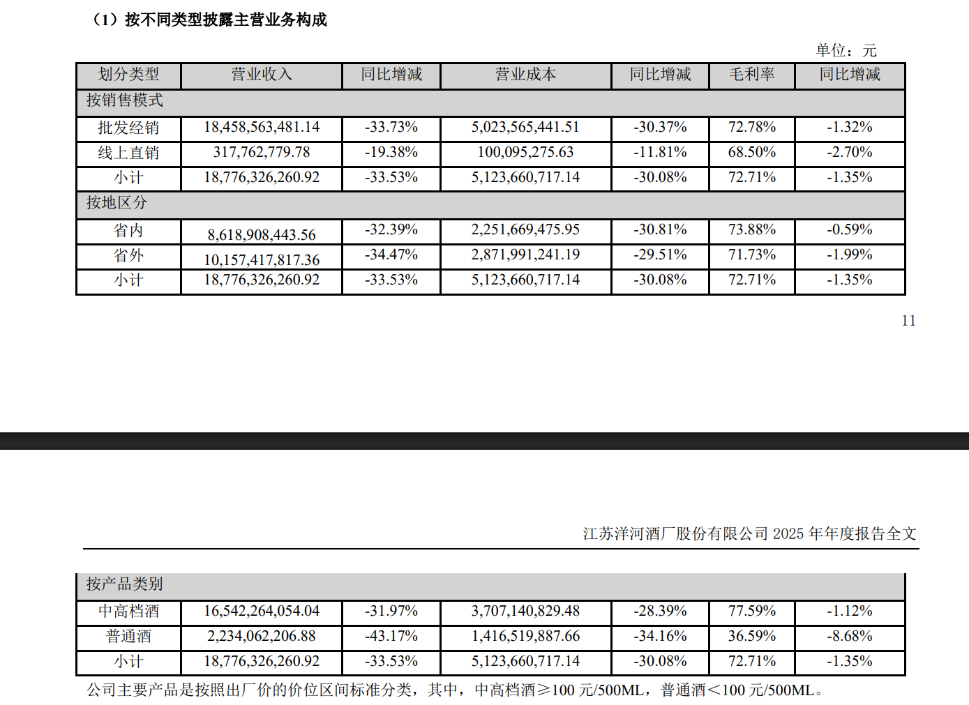從銷售模式來看,2025年,洋河股份批發經銷模式實現營收184.59億元,同比下降33.73%;線上直銷模式營收3.18億元,同比下降19.38%。按地區劃分,省內實現營收86.19億元,同比下降32.39%;省外營收101.57億元,同比下降34.47%。