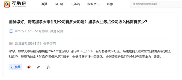 6月30日消息,今日,海康威視在深交所互動易平臺回應網友關於“加拿大事件影響及收入占比”的提問。