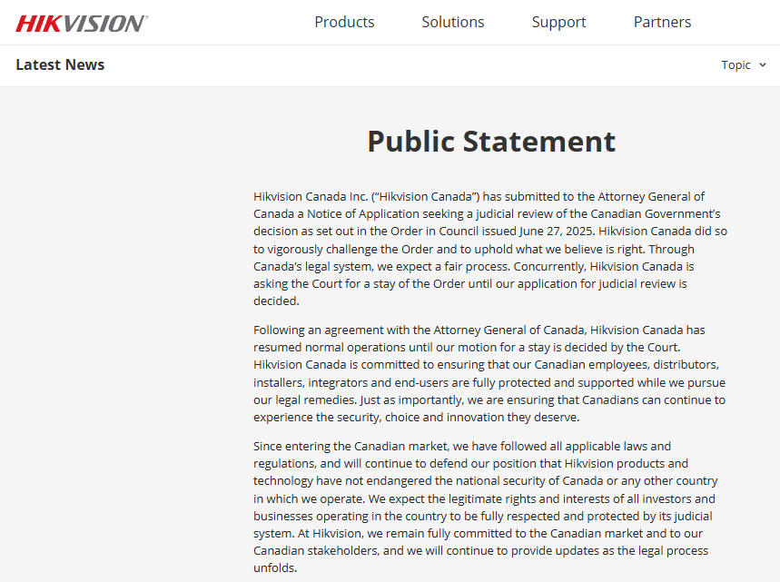 海康威視表示,自進入加拿大市場以來,一直遵守所有適用的法律和法規,公司將繼續捍衛其立場,即海康威視的產品和技術沒有危及加拿大或公司運營所在的任何其他國家/地區的國家安全。