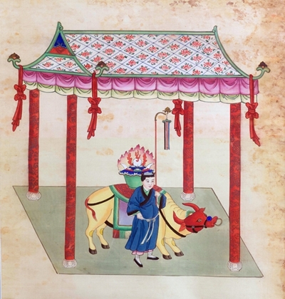 立春的前一日,宮中要舉行隆重的“進春儀”。屆時,順天府府尹會率僚屬赴東郊迎春,行一跪三叩之禮後,將春山寶座及芒神土牛迎入順天府大門,安設在彩棚內,再送至禮部供奉。同時,大興、宛平二縣縣令於午門外正中設案,恭奉春山寶座及芒神土牛。