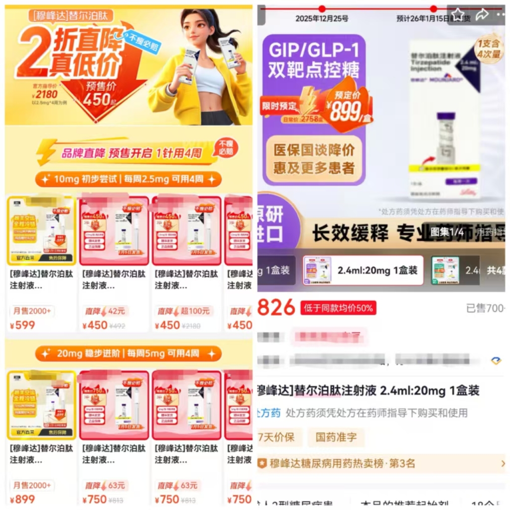 根據此前公佈的2025年醫保目錄,禮來的降糖版替爾泊肽(商品名:穆峰達)名列其中,這意味著2026年1月1日開始,降糖版替爾泊肽的患者自付價格將有望大幅下降。在此背景下,替爾泊肽在電商管道已經出現明顯的價格下降。在某電商平臺上,替爾泊肽開啟了預售模式,在官方補貼後,單支價格只有450元,較官方指導價2180元,前後降幅達到80%。還有電商平臺打出了“醫保國談降價,惠及更多患者”的宣傳。