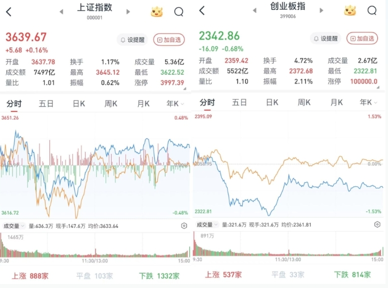 至收盤,上證綜指漲0.16%,報3639.67點;科創50指數跌0.15%,報1058.21點;深證成指跌0.18%,報11157.94點;創業板指跌0.68%,報2342.86點。