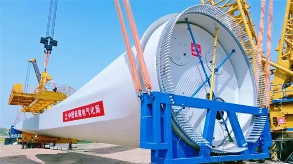 4月21日消息,中國鐵建電氣化局官宣,經過集團一公司參建者們3個多小時的安裝、調試,天潤大豐風電專案最後一支葉片在155米高空完美“轉體”與輪轂精准對接,標誌著我國自主研發生產的首臺16.2兆瓦陸上單機容量最大發電機組順利吊裝完成。