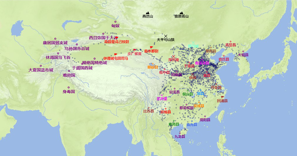注:1.西河郡各縣除了少數有確切遺址外,其他各縣位置方位皆不明。2.州刺史部駐地前期並不固定,有的州沒有刺史駐地,用三道同心圓標示。3.少部分郡國由於設立時間較短,後期併入其他郡故不標示,如益州沈黎郡、汶川郡、幽州帶方郡、真番郡、臨屯郡等。4.部分中原地區縣治所在地,今地名多為古城村、故城鎮、固城村、顧城鎮,故地址較為準確。極少部分縣治所在地今地名仍沿用漢代地名,其他縣治所在地位置並不十分確定可能錯誤較多。