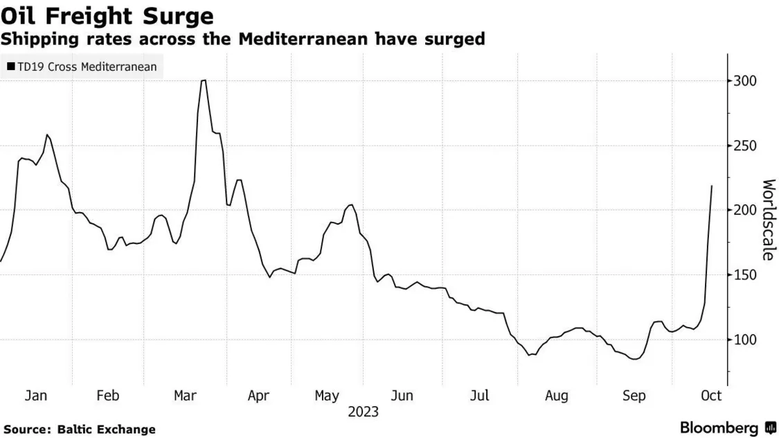 在新一輪巴以衝突爆發以來的一周,全球幾乎所有主要貿易路線的石油運輸成本都出現了飆升。倫敦波羅的海交易所的數據顯示,與10月9日相比,16條全球貿易航線的運費平均飆漲了50%以上,其中,穿越地中海的貿易航線的運費飆漲了一倍。