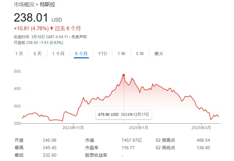 截至週一(3月17日)收盤,特斯拉的市值較去年12月曆史高點已暴跌了7000多億美元,相當於完全抹去了大選以來的漲幅。馬斯克的淨資產則蒸發了1000多億美元。