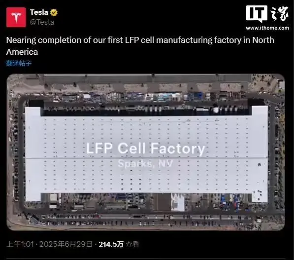 6 月 29 日消息,特斯拉宣佈,其位於北美地區的首座磷酸鐵鋰電池(LFP)製造工廠即將完工。該工廠選址於美國內華達州斯帕克斯市,毗鄰特斯拉現有的超級工廠(Gigafactory)。