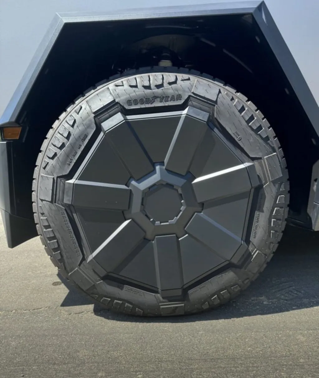 Cybertruck 採用了獨特的輪轂和輪胎設計方案,輪轂上有 7 個尖銳的設計,每個突出部分都設計成貼合輪胎側壁的凹槽。