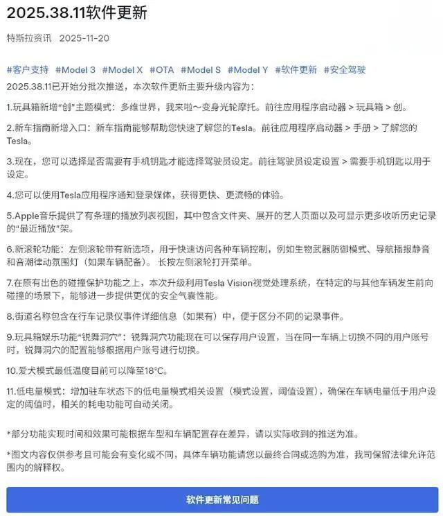 11 月 21 日消息,昨日,特斯拉中國開始分批推送 2025.38.11 版本軟體更新,覆蓋 Model 3/Y/S/X 四款車型。