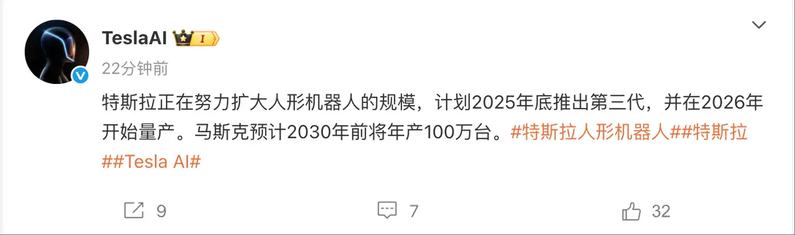 9月30日,特斯拉官方宣佈,特斯拉正在努力擴大人形機器人的規模,計畫2025年底推出第三代,並在2026年開始量產。馬斯克預計2030年前將年產100萬臺。