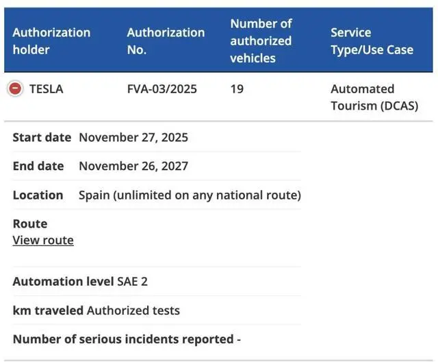 該專案的授權有效期為 2025 年 11 月 27 日至 2027 年 11 月 26 日。DGT 同時明確,特斯拉可在西班牙任何國家級道路開展不限次數的 FSD 測試。鑒於特斯拉目前已進入 ES-AV 計畫的第三階段,車上安全操作員已非強制要求,遠程監控亦被允許。