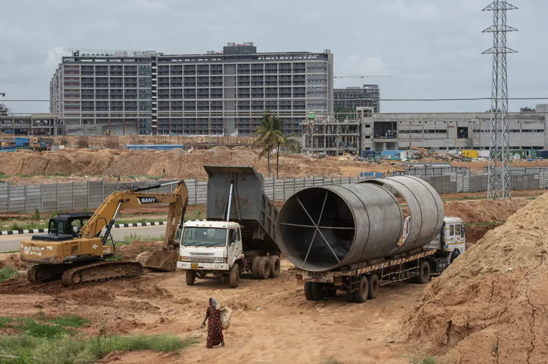 這座最新工廠是蘋果在印度多個生產工廠中規模最大的一座。它的主體框架仍在興建中,在紅土上拔地而起。塔吊正在高聳的女工宿舍樓框架上方忙碌作業。目前,已有大約8000名工人在兩座廠房內工作。不久之後,這一數字將增至4萬人。