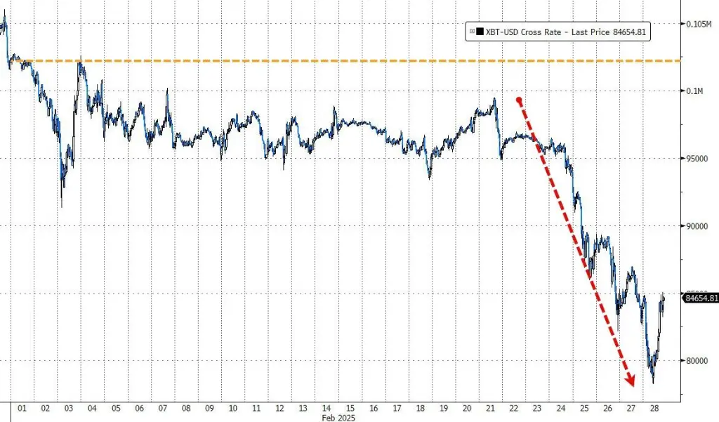 2月,比特幣月度跌幅達18%,為2022年6月以來最大單月跌幅。最近一周,跌勢加劇,週五一度下跌7.2%至78226美元,較峰值跌幅達28%。