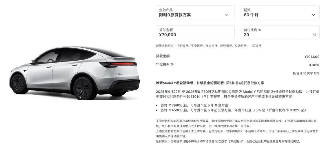 目前,特斯拉正為煥新版Model Y提供零息貸款。在關鍵市場中國,本土國產汽車的競爭已影響到了特斯拉銷量。特斯拉官網顯示,客戶在今年6月30日之前下單,可申請5年零息貸款方案。