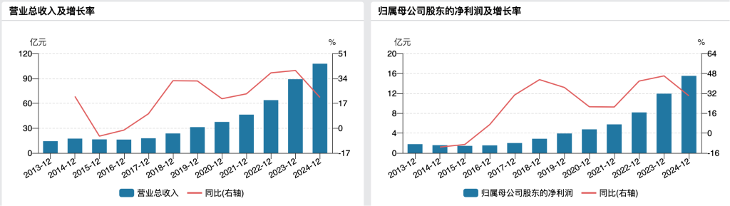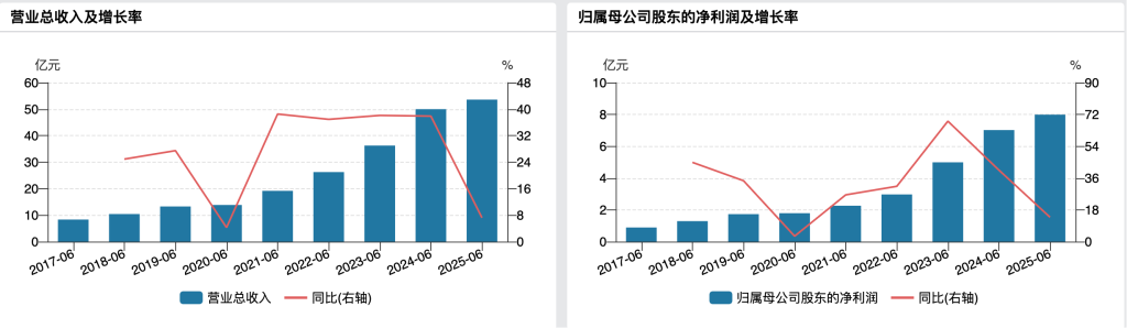 珀萊雅集團誕生於2003年,2017年11月於上交所上市,旗下擁有珀萊雅、彩棠、悅芙媞等知名品牌,覆蓋護膚、彩妝、洗護、高功效護膚等美妝領域。上市以來營收和淨利潤逐年增長,持續創歷史新高。去年珀萊雅繼續蟬聯最賺錢的國貨美妝公司,成為首個躋身“百億俱樂部”的國貨美妝企業。但需要注意的是,2024年和2025年上半年的業績面臨增速放緩的挑戰。