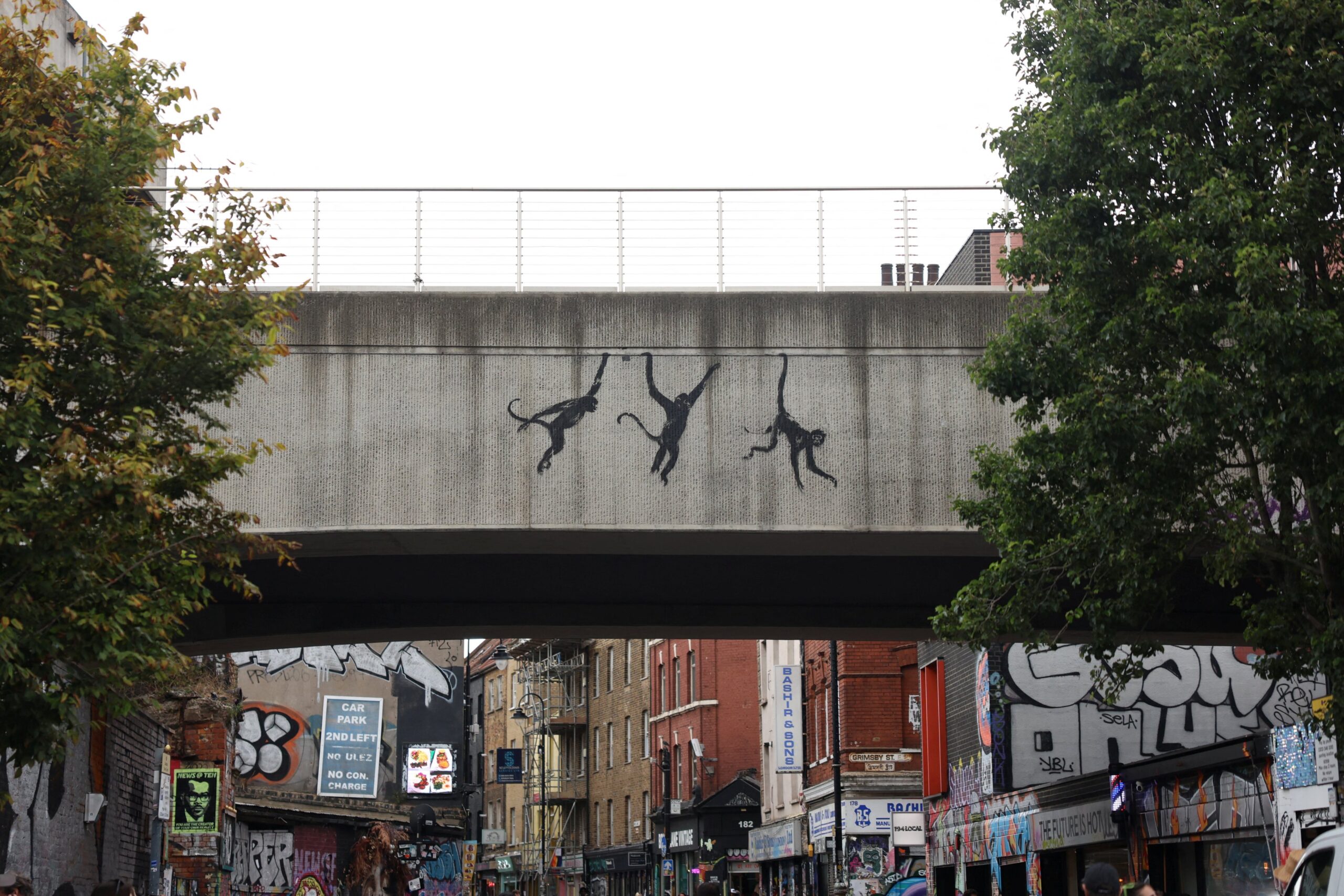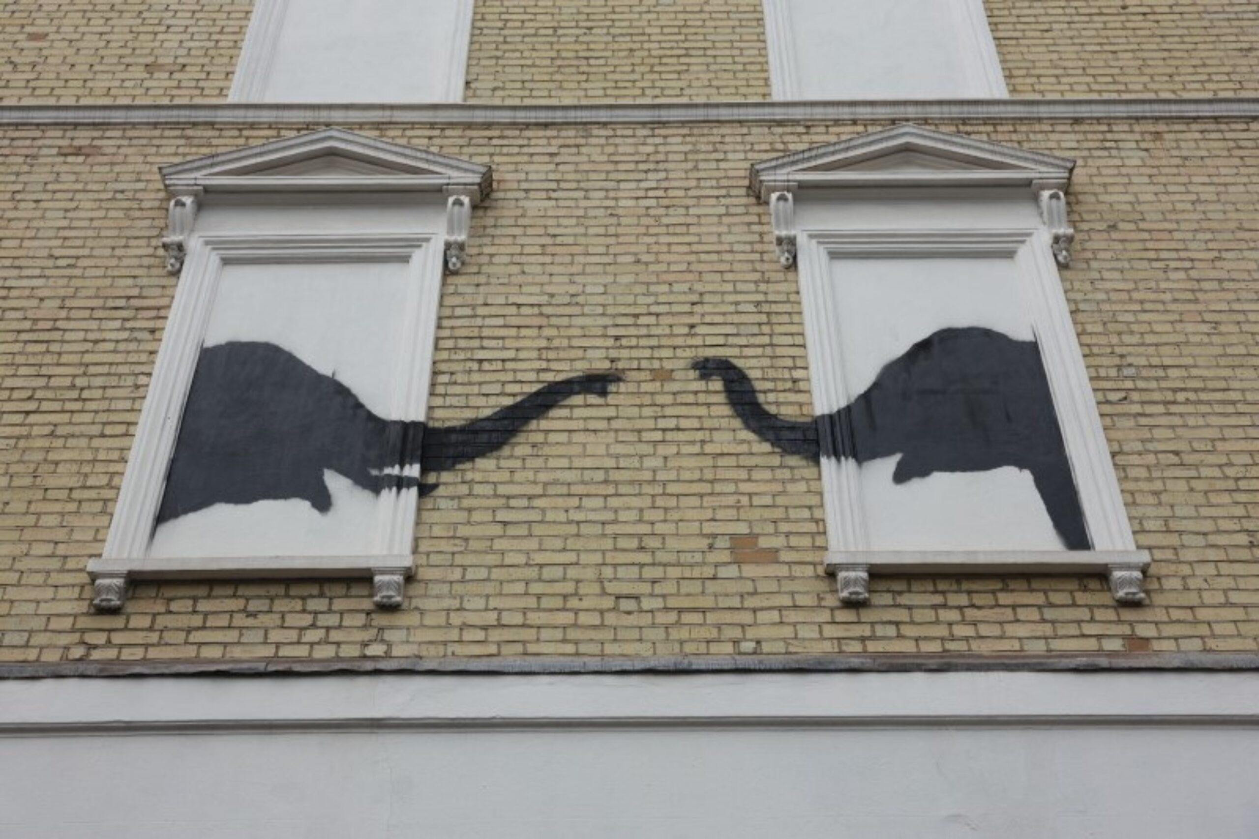 接著是兩只大象的頭,它們從位於切爾西富人區一棟房子側面的兩扇被遮住的窗戶中探出頭來,然後是三只猴子,它們似乎被吊在倫敦東部布裏克巷附近的一座鐵路橋上。
