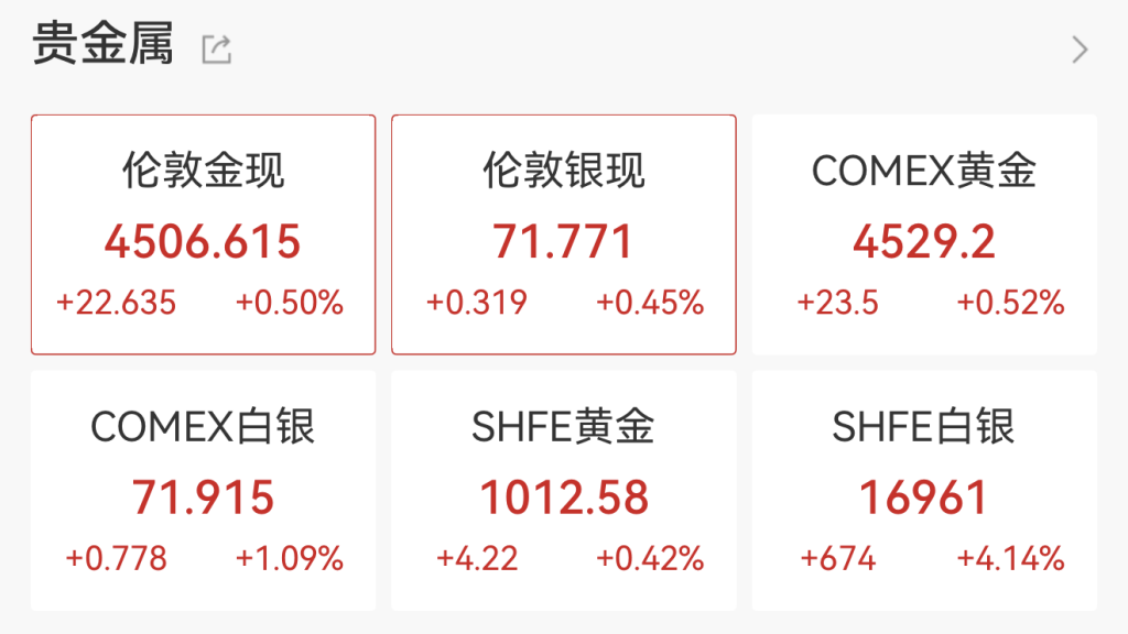12月23日,現貨黃金盤中再創歷史新高,逼近4500美元/盎司。現貨白銀首次突破70美元/盎司。國際貴金屬期貨普遍上漲,COMEX黃金期貨收漲1.02%,報4515美元/盎司,創歷史新高;COMEX白銀期貨收漲4.44%,報71.61美元/盎司,創歷史新高。