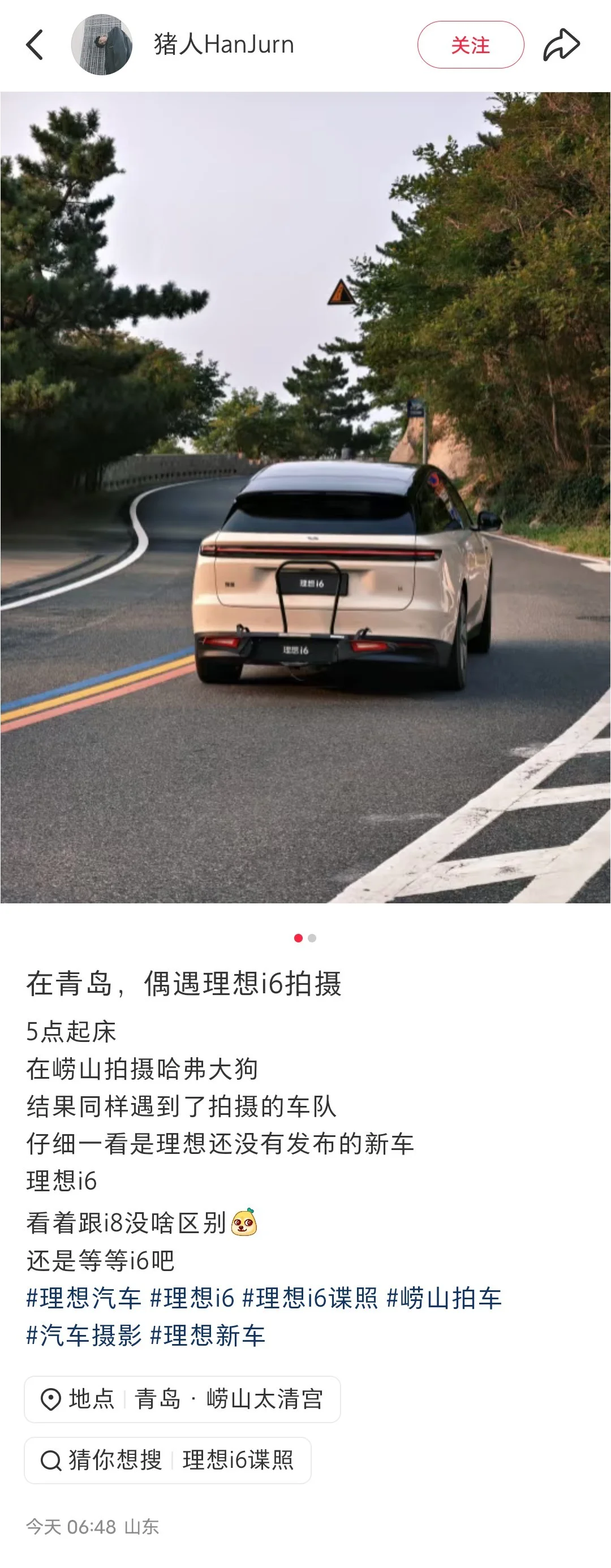 8月29日,小紅書博主“豬人HanJurn”發文稱,在青島偶遇理想未發佈的新車:理想i6,並表示“看著跟i8沒區別。”