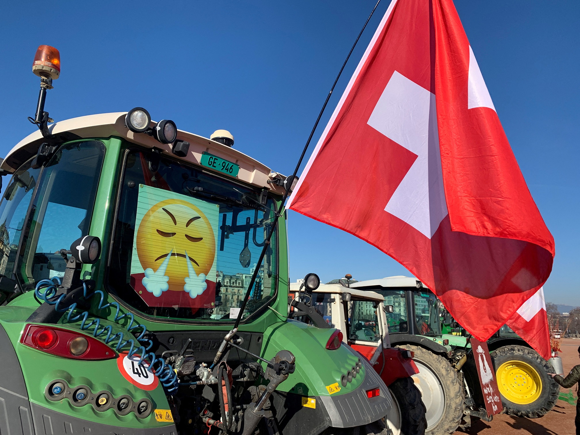 抗議活動包括約30輛拖拉機停在瑞士第二大城市中心的一個廣場上,上面寫著“我們的結局將是你的饑餓”等標語。