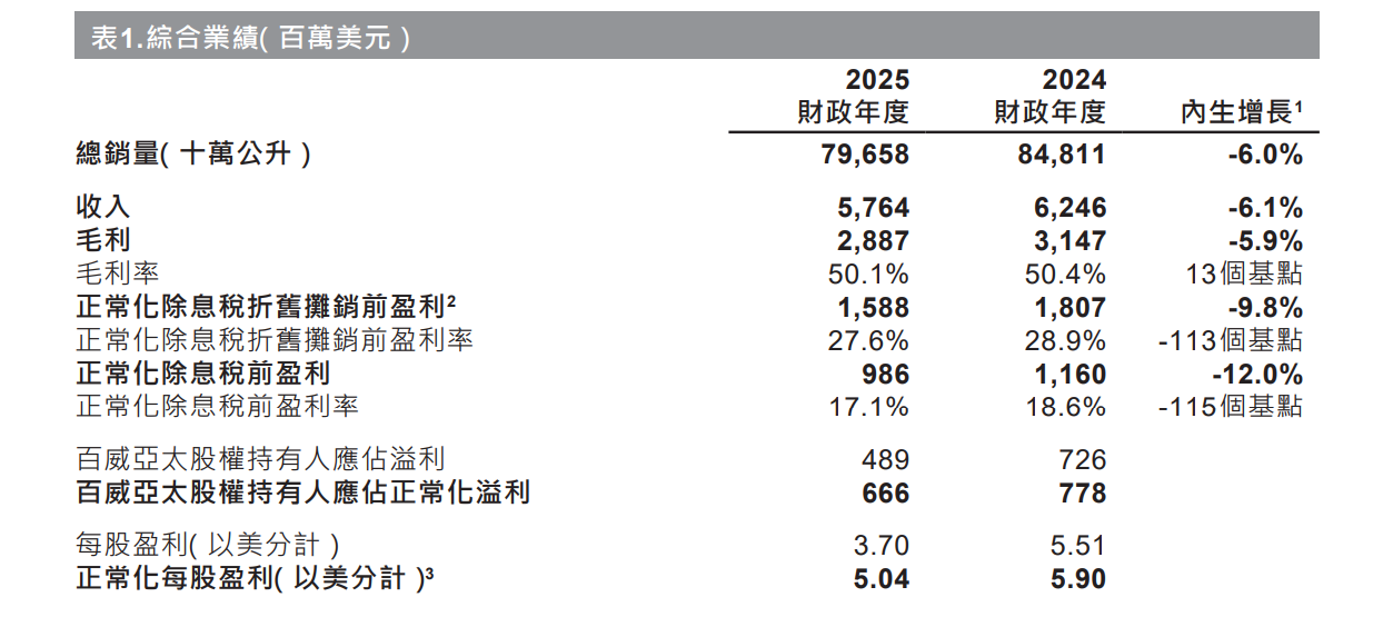 2月12日,百威亞太控股有限公司(百威亞太,01876.HK)在港交所披露截至2025年12月31日止年度的全年業績。2025年,公司啤酒總銷量減少6.0%;收入57.64億美元,同比下降6.1%,每百升收入則減少0.2%;股權持有人應占溢利為4.89億美元,同比下降32.64%;股權持有人應占正常化溢利為6.66億美元,同比下降16.82%。