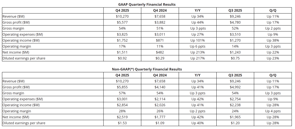 2025年全年,公司營收達到346.39億美元,同比增長34%,GAAP下淨利潤43.35億美元,Non-GAAP下每股攤薄收益4.17美元。