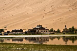 位於巴丹吉林沙漠腹地的蘇敏吉林湖畔坐落著一座沙漠古廟——巴丹吉林廟,寺廟氣勢雄偉、莊重肅穆,被稱為“沙漠故宮”,建於1755年,距今有兩百多年的歷史。據傳,當時建廟所用的一磚一瓦一木,全由幾百里外的地方用駱駝馱進沙漠。