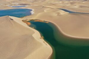 巴丹吉林沙漠年降水量極低,可在這大片的沙丘之間,卻分佈著144個湖泊,其中多數清澈湛藍,但也有部分湖泊呈現出紫色、紅色等炫目的色彩,沙山倒映在湖泊中,沙水天相連,蔚為壯觀。這裏的湖泊水主要源於大氣降水入滲沙山形成貯存於沙山中的地下水,也有來自青藏高原的遠源地下水補給,以及流經河西走廊的黑河形成的地下水和其他地下水的近源補給。