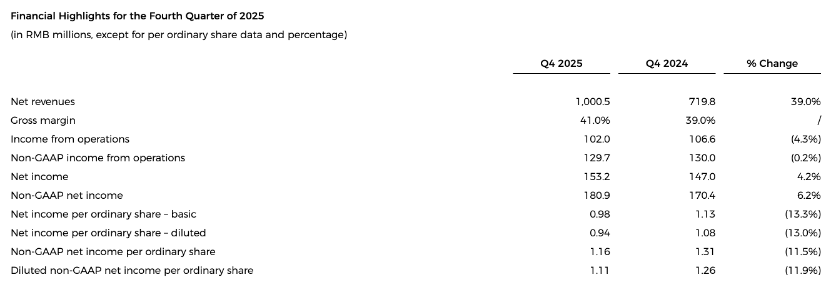 展望2026年第一季度,該公司預計營收在6.5億元至7億元之間,同比增長約24%至33%。