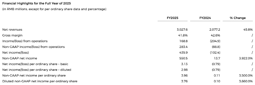 全年來看,禾賽2025年全年營收達30.28億元,同比增長45.8%;2025年全年歸屬於公司普通股股東的淨利潤為4.36億元,上年歸屬於公司普通股股東的淨虧損為1.02億元;歸屬於公司普通股股東的Non-GAAP淨利潤5.51億元,較上年0.14億元增長3922%。