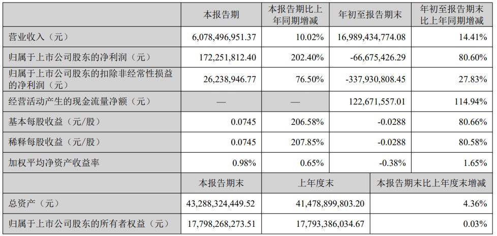 10月20日晚間,科大訊飛股份有限公司(科大訊飛,002230)發佈三季度報告。第三季度實現營業收入60.78億元,同比增長10.02%;歸母淨利潤1.72億元,同比增長202.40%;扣非淨利潤2623.89萬元,同比增長76.50%;經營性現金流淨額8.95億元,同比增長25.19%,實現季度淨利潤與現金流的轉正。