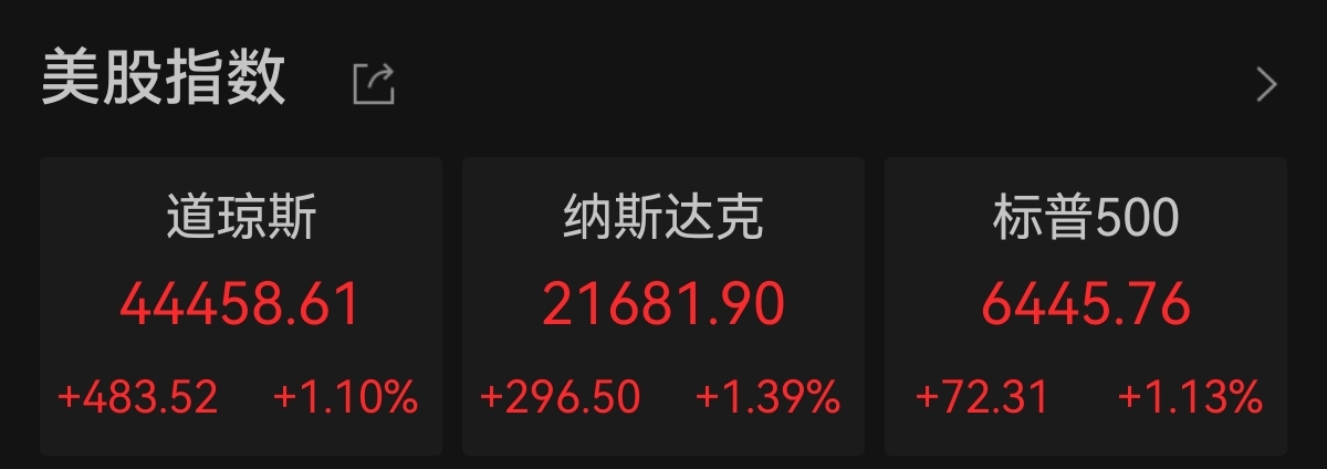 截至收盤,道瓊斯工業指數漲483.52點,漲幅1.10%,報44458.61點;納斯達克指數漲296.50點,漲幅1.39%,報21681.90點;標普500指數漲72.31點,漲幅1.13%,報6445.76點。