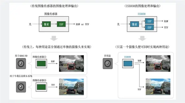 根據官方介紹,ISX038圖像感測器搭載了索尼自研的ISP(圖像信號處理器),可以獨立的系統處理並輸出高級駕駛輔助系統(ADAS)和自動駕駛系統(AD)所需的對車外環境檢測和識別的RAW圖像,以及提供給行車記錄儀和AR攝像頭等車載設備使用的YUV圖像。