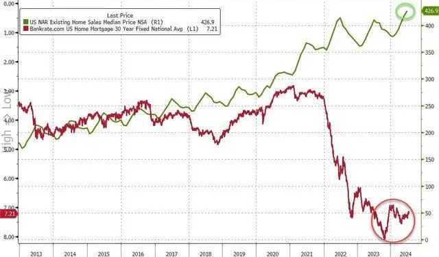 當前市場等待美聯儲降息。截至7月12日當周,30年期按揭貸款合同利率從今年4月的7.29%高點降至6.87%。不過這仍然是2021年底水準的兩倍。