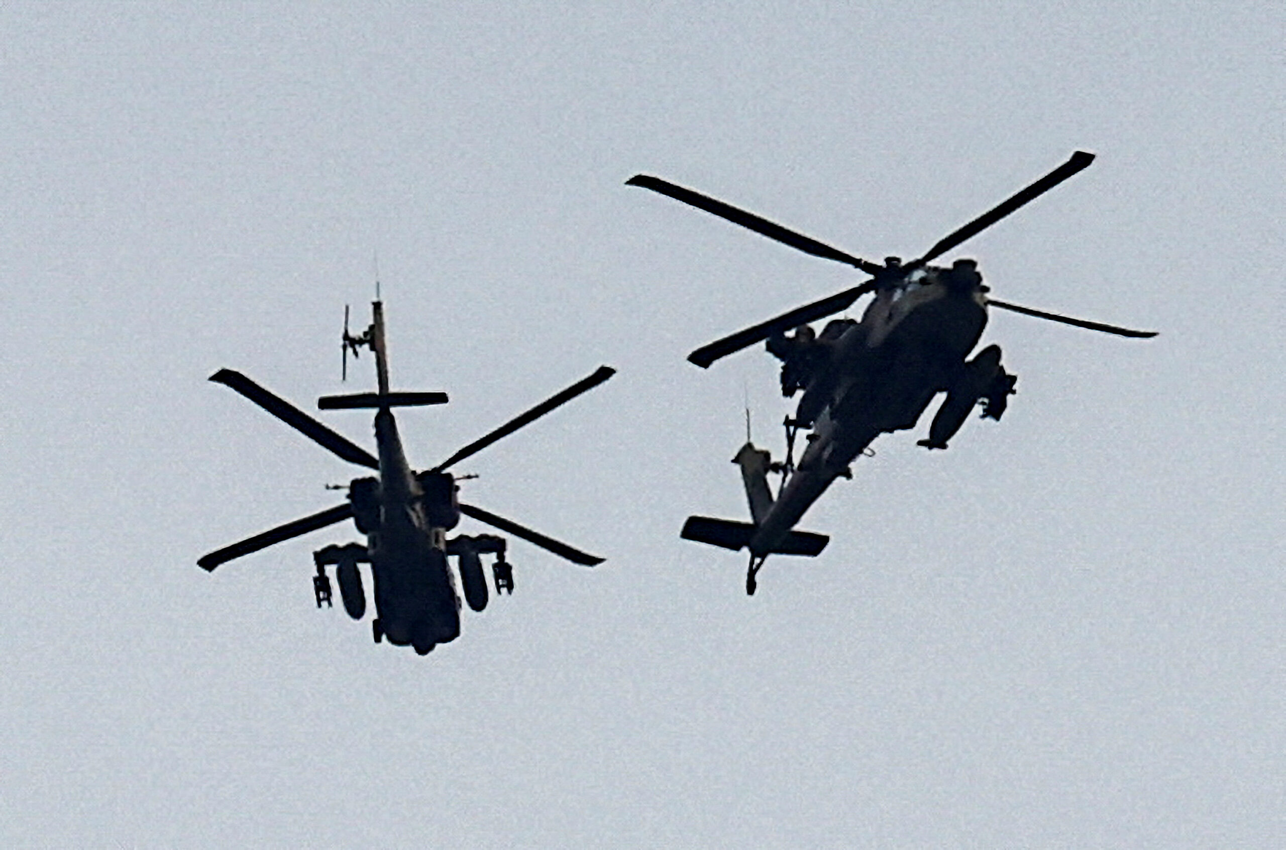 Israeli military helicopters fly near the Israel-Gaza border, amid the ongoing conflict between Israel and the Palestinian Islamist group Hamas, as seen from southern Israel, December 7, 2023. REUTERS/Athit Perawongmetha