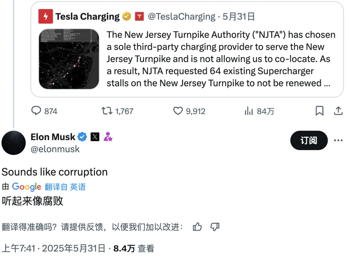 6月4日,據《紐約時報》報導,美國新澤西州收費公路管理局(NJTA)正在更換沿線的60多個特斯拉超級充電樁,原因是該州未與特斯拉續簽合同。