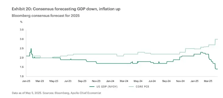 Sløk預測,到今年年底,通脹率可能會徘徊在3%左右。他指出,這比之前的預測“顯著增加”,在特朗普4月份宣佈全面徵收關稅之前,該公司一直將通脹預測固定在2.4%左右。
